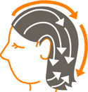 | 経絡ライン(膀胱経・胆経・三焦経)に沿って、ブラシを頭皮にしっかり密着させ、頭の前から後側へブラッシングして下さい。(膀胱経、胆経のラインは、後頭部の下までブラッシング) |